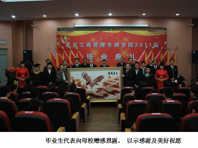 随后,陈晓曦副院长、廖胜荣副院长先后宣读了2011届我校专科和本科学生毕业决定及毕业学生名单。并由领导嘉宾为毕业生颁发了北京工商管理专修学院毕业证书和中国石油大学毕业证书、学位证书。并对获得本科毕业证的同学给予了200元奖金,对获得学士学位证的同学给予了600元奖金,以肯定和激励他们通过刻苦努力取得的成绩。毕业生代表们给母校送上了承载了浓浓情意的感恩匾,表达了毕业生们“师恩深厚,永世不忘”的谢意和情怀,也充分体现了我校多年来“感恩教育”的丰硕成果。