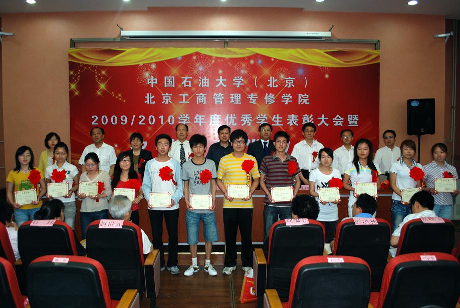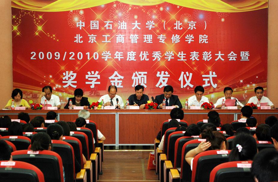 2010年5月24日上午由北京工商管理专修学院和中国石油大学(北京)远程教育学院共同承办的2009/2010学年度优秀学生表彰大会暨奖学金颁发仪式在北楼第四阶梯隆重举行。中国石油大学(北京)远程教育学院院长张云祥、直属中心主任王颖贤,学院院长平桂祥、执行院长赵克让等莅临了本次大会。各系、部、处、室负责同志、教师代表、学生代表参加了大会。会议由教务处处长徐觅主持。