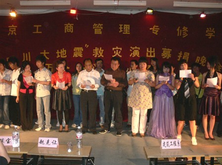 2008512,自四川汶川发生8级地震之后,全球关注,举国动容,这引起了我院师生的震惊、悲伤、敬佩、和感动,所以由我院文工团携绿色快讯于518晚在我校第一教学楼第二阶梯教室举行了一场大型的募捐义演晚会。在院领导讲话之后,各系领导以及学生代表进行了募捐仪式。