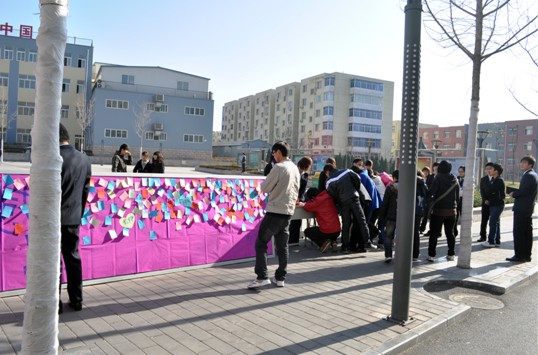院学生会成员亲手制作的一张张彩色的便利贴,让同学们填写上祝福父母、祝福老师、朋友,感恩大自然、感恩社会的温馨话语,贴在一起形成一张绚丽的彩带,绘成一幅温馨动人的画面。