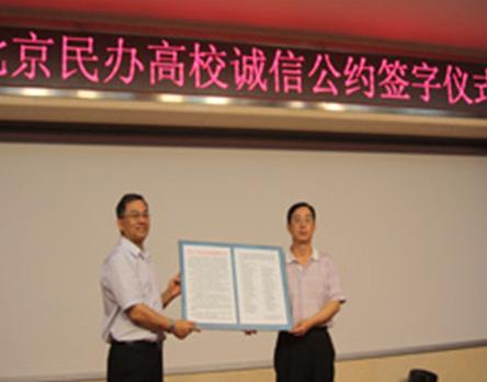2011年7月16日上午9点,由北京市民办教育协会和北京市消费者协会教育系统分会主办的“2011年北京民办高校诚信公约签字仪式暨诚信招生展示季通知”在北京城市学院举行。北京市民办教育协会监事会监事长、原北京市教委副主任杜松彭,北京市民办教育协会常务副会长、原北京教育考试院副院长吴凤臣,北京市社会工委委员社会办副主任刘轩,北京市社会团体管理办公室民非处处长高卓,北京市消费者协会消费指导与监督部主任罗刚等出席了签字仪式,仪式由市民办教育协会副秘书长马学雷主持。全市43家民办高校参加了此次诚信公约签约仪式。新华社、中央电视台、北京电视台、人民日报、中国教育报、中国青年报、新京报、北京考试等诸多中央在京及市属媒体进行现场采访和报道,新浪教育频道独家对整个诚信公约签字仪式作全程网络视频录播报道,受众范围可辐射至全国考生及家长。