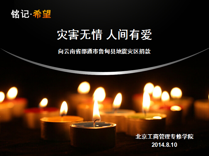 此次爱心捐款活动的举办,充分展现了我院全体领导及教职员工面对困难的社会责任感和使命感,也更展现了北工商人的爱心,用实际行动全力支持鲁甸抗震救灾工作。大家坚信伸出我们的援助之手,万众一心、众志成城、团结互助、和衷共济,奉献爱心,用我们的真情,点燃一份希望,抚慰灾区人民的创伤,无疆大爱可以温暖同胞之心,众志成城定能共同战胜灾难!帮助灾区人民渡过难关,早日重建美好家园。