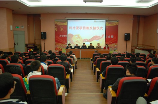 2010年10月28日上午9:00,在学院多媒体报告厅举行利比亚国际项目班交接仪式。与会领导有:院长助理周玉洁、课程开发与教育合作中心副主任张国金、建筑工程学院常务副院长马连弟、副院长林鹤岩和孙颖,国际学院副院长陈兴夫、张少峰,利比亚国际项目班班主任张春敏和建工学院部分班主任也参加了会议,会议由课程开发与教育合作中心施锦丽老师主持。