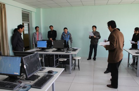 信息中心杨小波老师向参加验收的领导介绍了此次实验室建设购置的电脑、服务器、交换机、投影仪等项指标;总务处王家刚处长介绍了此次实验室建设的改造装修布线以及电脑桌椅的采购情况;课程开发与教育合作中心副主任张国金介绍了软件选择的原则、软件的内容等基本情况和师资培训情况;广联达软件股份有限公司的技术人员现场演示了软件各个模块的操作和基本功能。